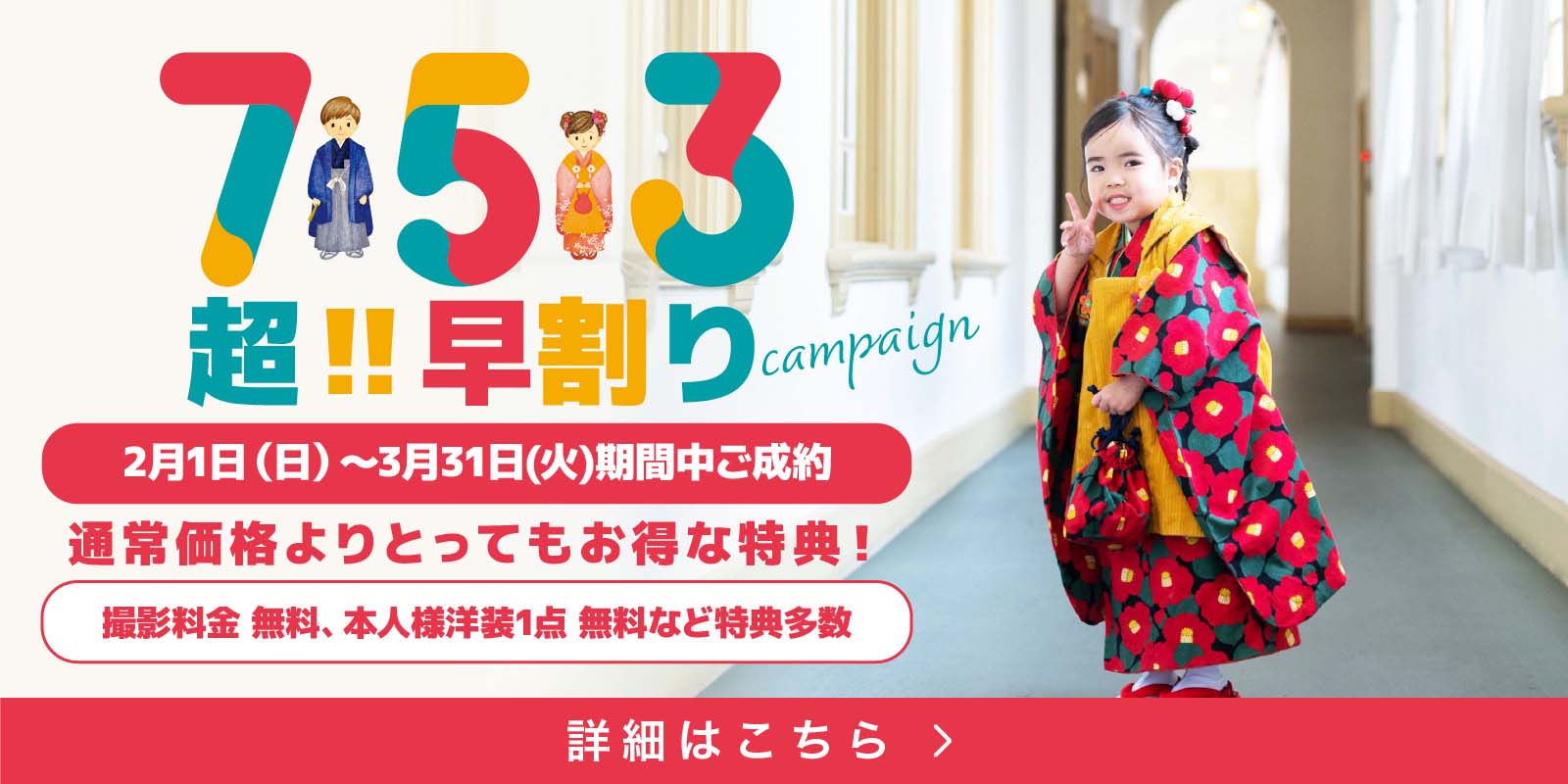 ✨七五三超‼︎早割りキャンペーン✨七五三 対象の年齢のお子さまがいるご家族様へ!2月1日〜3月31日(火)の期間中ご成約の方対象で、七五三撮影がとってもお得になる特典を… -