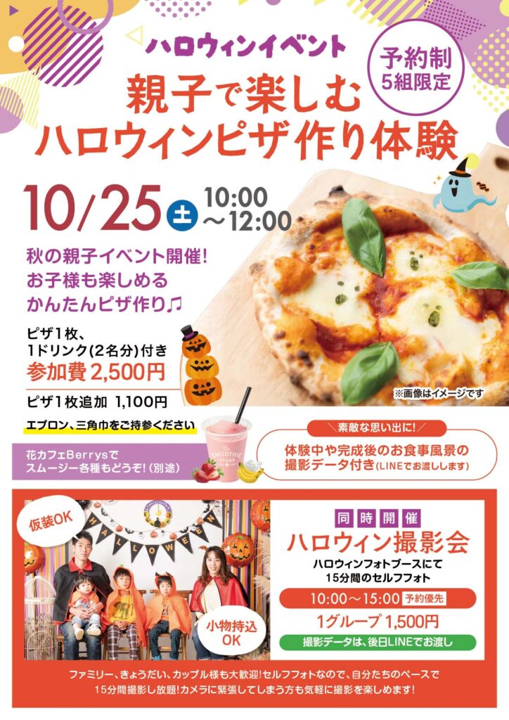 ハロウィンイベント🎃開催します!☆10月25日(土)10:00〜12:00☆☆親子で楽しむハロウィンピザ作り体験☆.5組様限定の予約制です。親子で楽しめるハロウィンをイメージしたピ… -