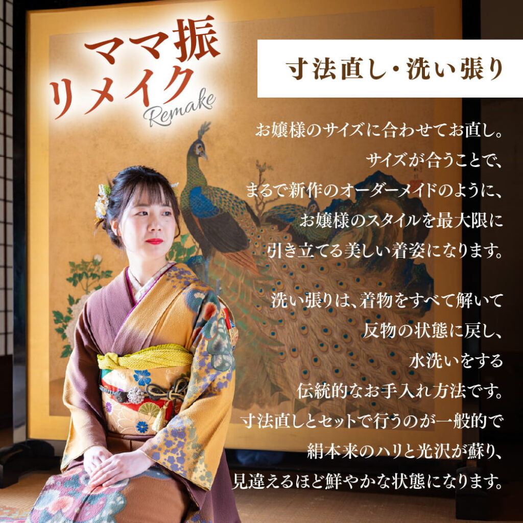 サイズが合うことで、まるで新作のオーダーメイドのように、お嬢様のスタイルを最大限に引き立てる美しい着姿になります。洗い張りは、着物をすべて解いて反物の状態に戻し、水洗いをする伝統的なお手入れ方法です。寸法直しとセットで行うのが一般的で、絹本来のハリと光沢が蘇り、見違えるほど鮮やかな状態になります。
