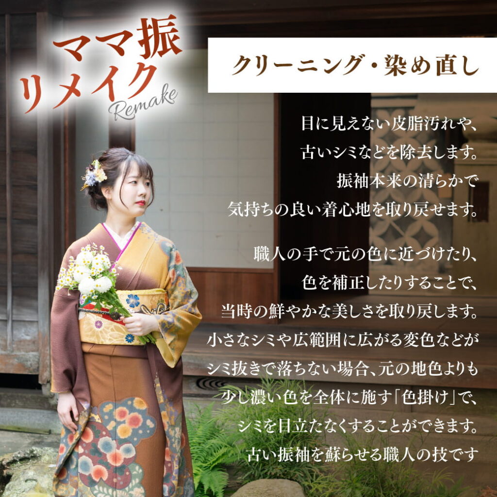 小さなシミや広範囲に広がる変色などがシミ抜きで落ちない場合、元の地色よりも少し濃い色を全体に施す「色掛け」を行うことで、シミを目立たなくすることができます。これは古い振袖を蘇らせる魔法のような職人の技です。