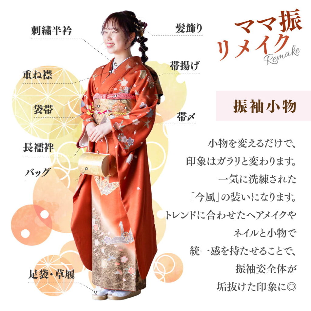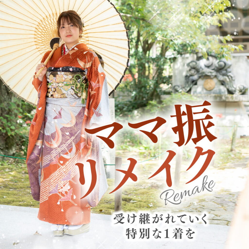 ママ振はお母様やお祖母様、お姉様などご家族の思い出の1着をお嬢さまが振袖として着用することをいいます。同じお着物でも小物を変えることで、お嬢様の個性を生かしたトレンドなコーディネートも叶います✨