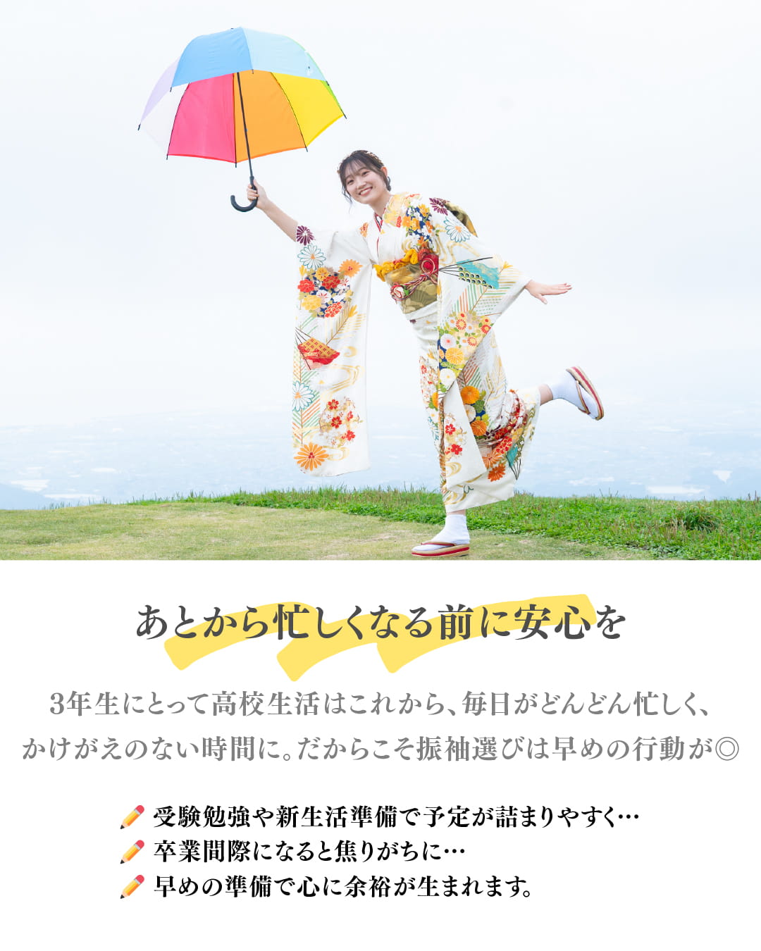 ✏️高校生の今から動き出すと、余裕のあるスケジュールで成人式を迎えられます。