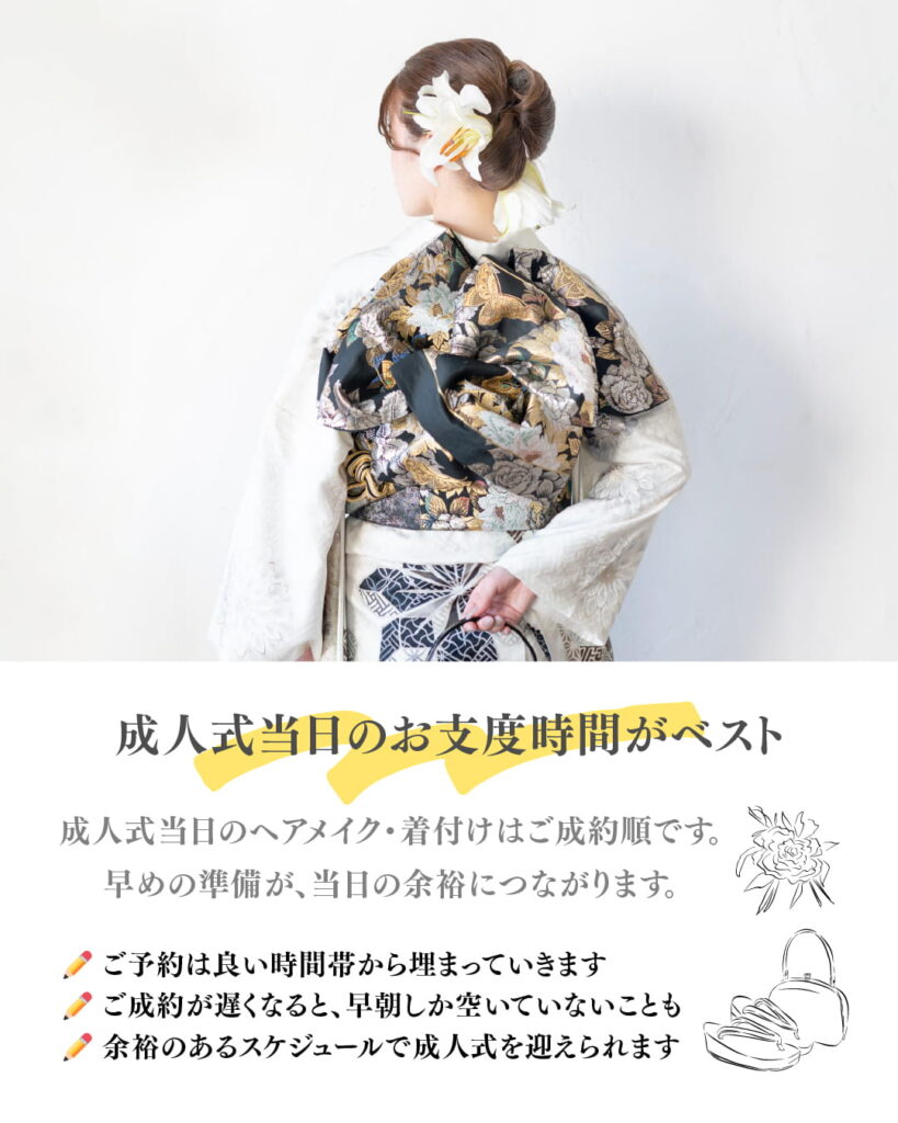 成人式当日のお支度時間がベストタイムで選べる!