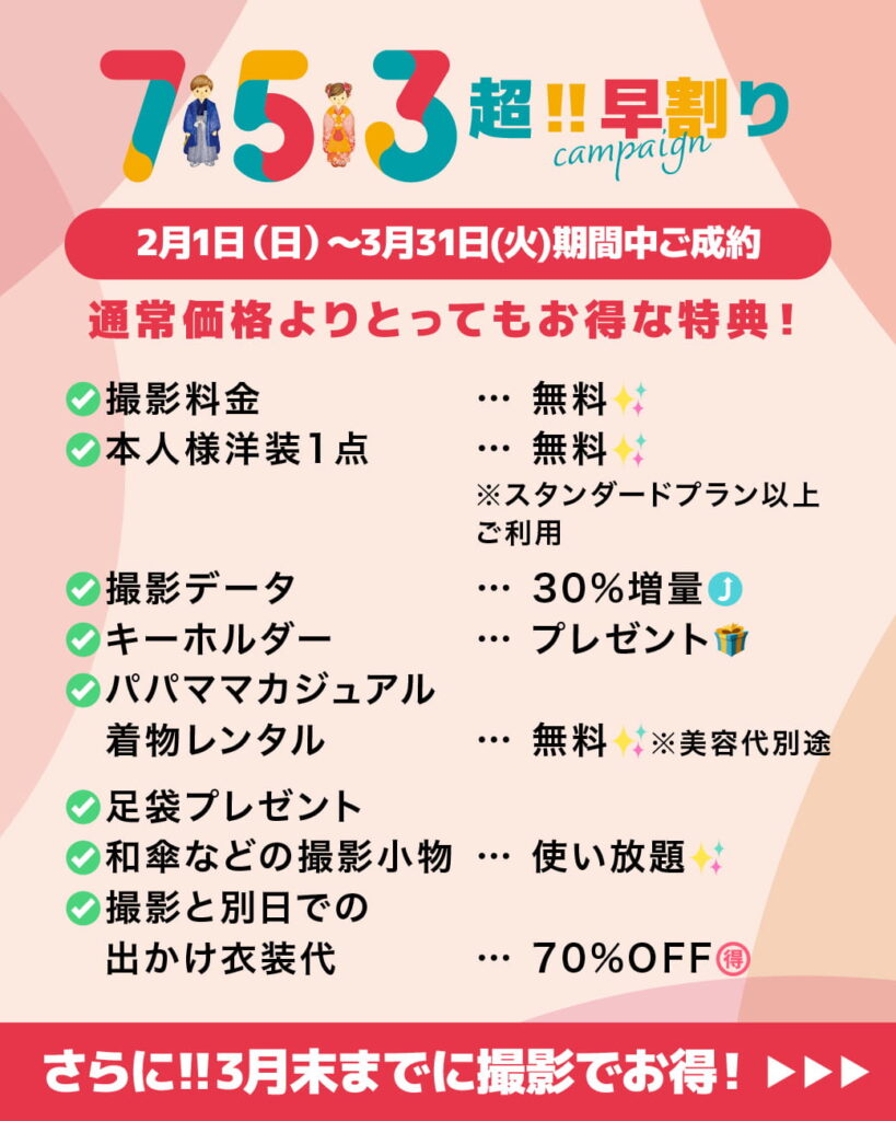 2月1日〜3月31日(火)の期間中ご成約の方対象で、七五三撮影がとってもお得になる特典をご用意しました!